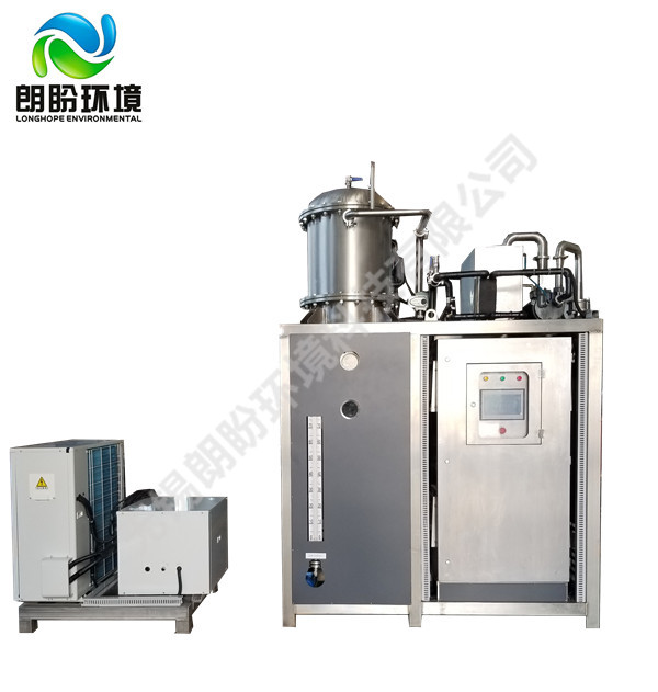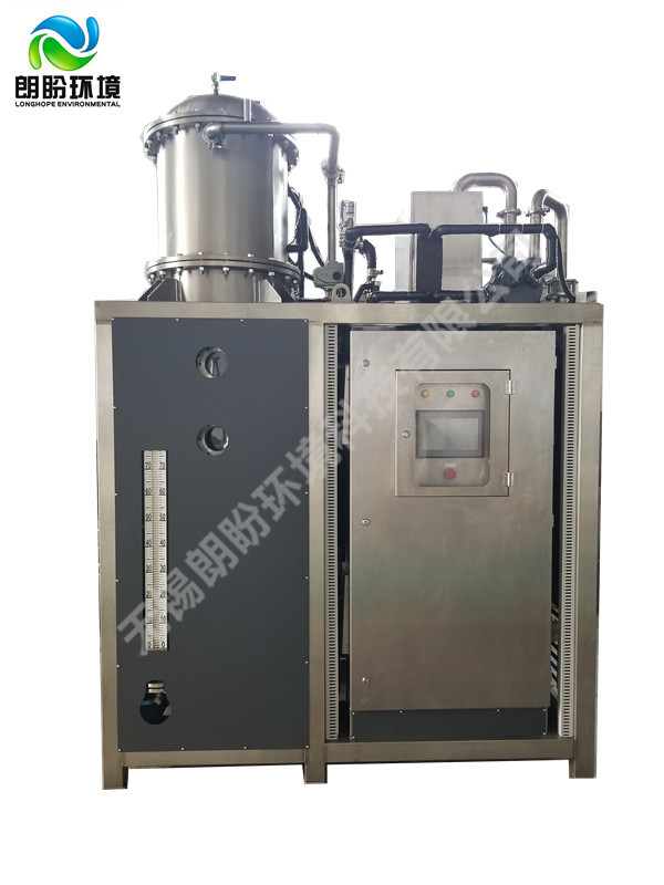 低溫萃取濃縮器的原理是物料的沸點隨著壓強的降低而降低。低溫節能濃縮設備整體保持真空狀態,濃縮室的真空度約為95%~97%,在此壓強下水的沸點為35℃~37℃,系統無需配備進料泵,利用蒸發室的負壓將物料吸進蒸發室,通過強制循環方式將物料循環霧化,傳輸至換熱器上,物料中水分被蒸發,物料連續循環霧化,通過蒸發室液位自動補料,濃度達到要求后作為濃縮液排出設備。濃縮液一般粘度較大,需采用泵抽出。