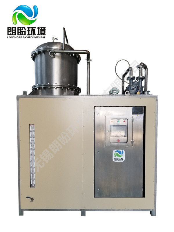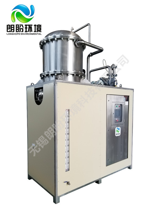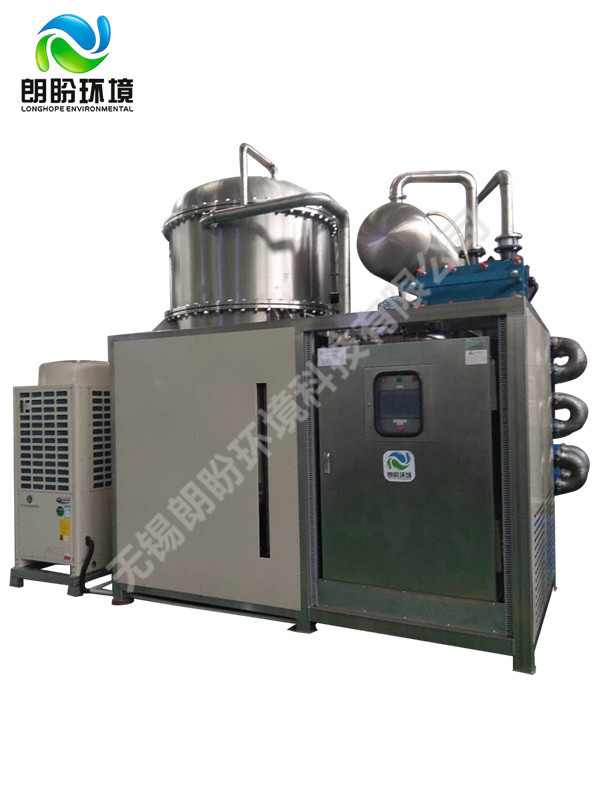 • 熱泵濃縮蒸發器的原理是物料的沸點隨著壓強的降低而降低。低溫節能濃縮設備整體保持真空狀態,濃縮室的真空度約為95%~97%,在此壓強下水的沸點為35℃~37℃,系統無需配備進料泵,利用蒸發室的負壓將物料吸進蒸發室,通過強制循環方式將物料循環霧化,傳輸至換熱器上,物料中水分被蒸發,物料連續循環霧化,通過蒸發室液位自動補料,濃度達到要求后作為濃縮液排出設備。濃縮液一般粘度較大,需采用泵抽出。