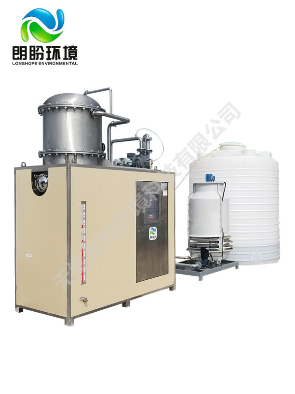 負壓濃縮蒸發器的原理是物料的沸點隨著壓強的降低而降低。低溫節能濃縮設備整體保持真空狀態,濃縮室的真空度約為95%~97%,在此壓強下水的沸點為35℃~37℃,系統無需配備進料泵,利用蒸發室的負壓將物料吸進蒸發室,通過強制循環方式將物料循環霧化,傳輸至換熱器上,物料中水分被蒸發,物料連續循環霧化,通過蒸發室液位自動補料,濃度達到要求后作為濃縮液排出設備。濃縮液一般粘度較大,需采用泵抽出。