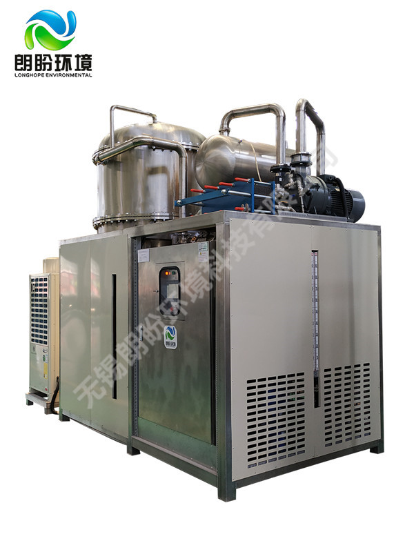 • 低溫蒸發(fā)結(jié)晶器的原理是物料的沸點隨著壓強的降低而降低。低溫節(jié)能濃縮設(shè)備整體保持真空狀態(tài),蒸發(fā)室的真空度約為95%~97%,在此壓強下水的沸點為35℃~37℃,系統(tǒng)無需配備進料泵,利用蒸發(fā)室的負(fù)壓將物料吸進蒸發(fā)室,通過強制循環(huán)方式將物料循環(huán)霧化,傳輸至換熱器上,物料中水分被蒸發(fā),物料連續(xù)循環(huán)霧化,通過蒸發(fā)室液位自動補料,濃度達到要求后作為濃縮液排出設(shè)備。濃縮液一般粘度較大,需采用泵抽出。